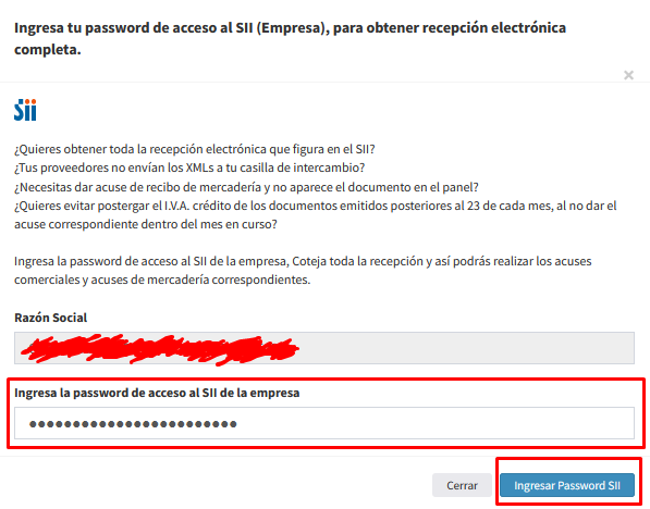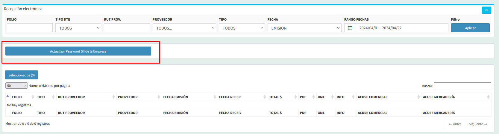 Ingresar o actualizar contraseña empresa de SII para recepción de documentos de proveedor